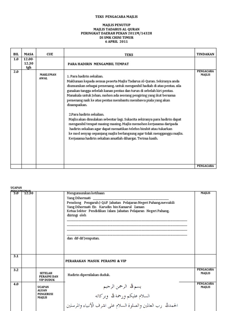 Teks pengacara majlis perhimpunan rasmi mingguan from image.slidesharecdn.com Yang berbahagia, encik yew kok leh, pengetua smk jalan mengkibol. Koleksi pantun majlis merupakan hasil rujukan daripada beberapa laman web dan ada yang telah diubahsuai mengikut kesesuaian majlis. Koleksi teks pengacara majlis yang amat berguna kepada para guru di sekolah. Sirih junjung berhias indah, sekacip pinang pembuka kata, bunga manggar kilau bercahaya, datang berkuunnjg ke majlis meriah, sejarah terukir nilai permata, lembaran sejarah kini bermula. Untuk makluman semua, teks pengacara majlis ini disediakan untuk majlis perpisahan mantan guru penolong kanan sekolah ieqa, sk temenggong abdul rahman 2. Faridah binti omar, penolong kanan pentadbiran, en. Dapatkan teks pengacara majlis di sini. Sesungguhnya kita hanya mampu merancang dan dialah yang menentukan segalanya.